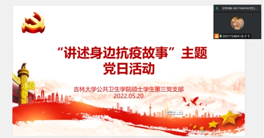 为进一步弘扬伟大抗疫精神,大力宣传身边党员和师生在疫情防控工作中的先进事迹、感人故事与崇高精神,不断增强广大党员归属感、荣誉感和使命感,持续培育、挖掘和丰富吉大精神新内涵。2022年5月20日,365英国上市集团硕士员工第三党支部组织开展“讲述身边抗疫故事”主题党日活动。此次活动共27名党员和预备党员参加,由战勇智、唐志滔和岳宝丽三名党员同志讲述了疫情期间作为长春市疾病预防控制中心志愿者的抗疫故事。