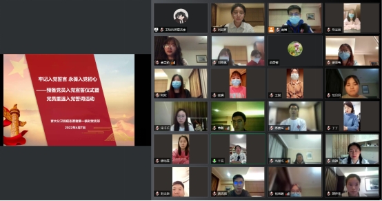 活动在庄严的《国际歌》中拉开帷幕,庞博同志致开幕辞,随后,支部组织委员曹鹏宣读参加入党宣誓的预备党员名单在庞博同志的带领下,新发展预备党员刘起君和参加活动的全体党员面向党旗,举起右拳,用激昂的声音庄严宣誓重温入党誓词,重忆入党初心铿锵有力的誓言传达出身为共产党员的自豪感和使命感激励党员同志不忘初心、牢记使命、坚持奋斗