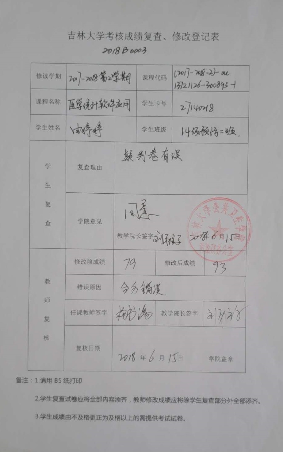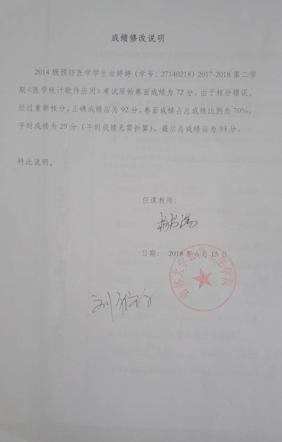 根据《关于进一步明确本科生课程考核等有关问题的通知》(校教字〔2018〕47号)文件有关精神,现对365英国上市集团公司2014级由婷婷同学(27140218)2017-2018-2《医学统计软件应用》成绩更正如下:
