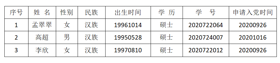 为了加强对发展党员工作的民主监督,确保发展新党员的质量,现将孟翠翠、高超、李欣3名发展对象的有关情况进行公示。