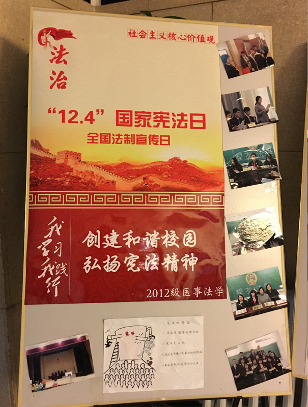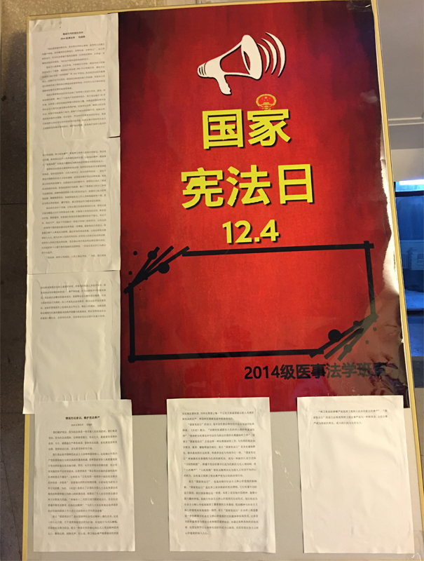 2015年12月4日是我国第二个国家宪法日。为了弘扬宪法精神,提高法制意识,365英国上市集团医事法学教研室组织2012级、2013级、2014级医事法学专业员工和医事法学专业硕士研究生,制作了“宪法宣传日展板”,传递依宪治国、依宪执政理念,弘扬宪法精神。