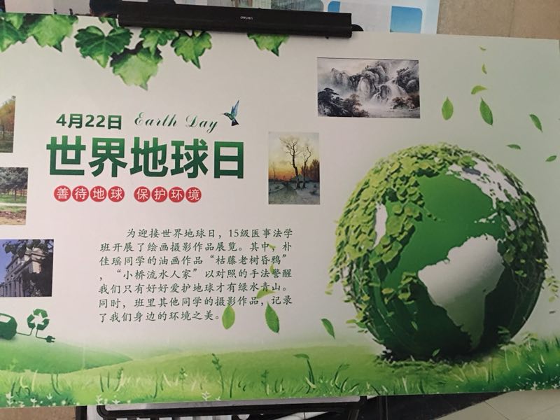同期,本班同学还以世界地球日为主题收取了本班同学的绘画摄影作品,并挑选其中部分制作了精美的展板,供师生观摩,了解世界地球日的要义。该活动在鼓励同学们用发现美的眼睛去观察身边环境的同时,也意识到我们生活的环境所存在的现实问题,并结合世界地球日的主旨,把保护环境的种子播种到每一位医法人的心中。其中,朴佳瑶同学的油画作品“枯藤老树昏鸦”,“小桥流水人家”以对照的手法警醒我们只有好好爱护地球才有绿水青山。