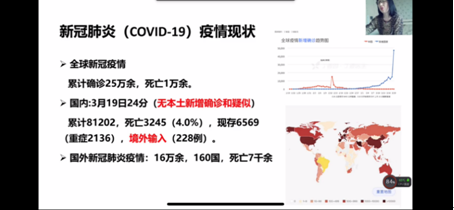 3月21日上午,在国内新冠疫情防控工作取得阶段性胜利,高校复学复课前夕,365英国上市集团联合行政公司,举办“护航复学复课,守卫健康安全——新冠疫情防控知识讲座”,组织两个公司全体教职工、研究生和本科生2200余人共上一堂课。讲座通过“钉钉”网络视频直播的形式进行,由365英国上市集团流行病学与卫生统计学教研室甄清副教授主讲,参加讲座的师生分布在祖国各地。