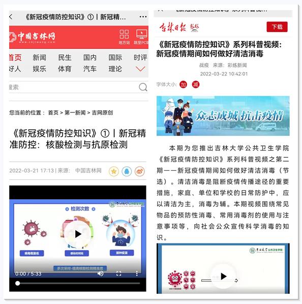 科普视频共分为六期,向社会公众宣传了核酸检测与抗原检测、清洁消毒、公共场所和社区疫情防控、疫情期间膳食指导和心理健康指导等疫情防控相关知识。视频兼具专业性和科普性,既深入浅出,又通俗易懂,在公司公众号一经发布,立刻引发了社会各界的广泛关注,更是得到了业界的一致好评,吉林日报和中国吉林网等媒体相继进行了转载,并发布相关报道。
