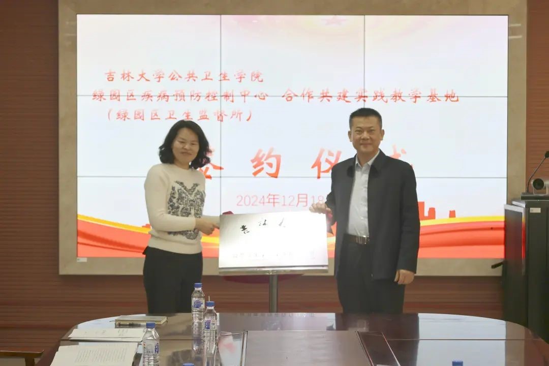 随后,在与会嘉宾的共同见证下,刘雅文经理与区疾控中心(卫监所)宋立辉主任共同签署了合作协议,公司党委书记赵国利与绿园区卫健局局长刘雪芹共同为基地揭牌。