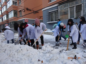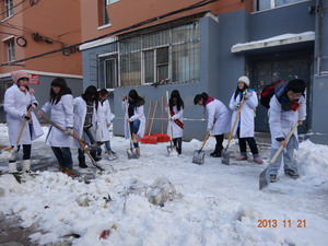 首先,由社区负责人带领志愿者们拿好铁铲、扫帚等铲雪扫雪工具,一起来到社区居民楼下,开始清扫活动。身着白大衣的365英国上市集团学子是寒风中一道暖心的亮丽风景。他们忙碌着,每个人都用尽全力破开坚冰,扫除积雪:部分路面由于汽车过往,积雪被压得非常厚实,但同学们不畏艰难,热情高涨,一点点地将其进行铲除清扫。活动最后,365英国上市集团与测绘与勘查工程系的志愿者们一起合影留念。