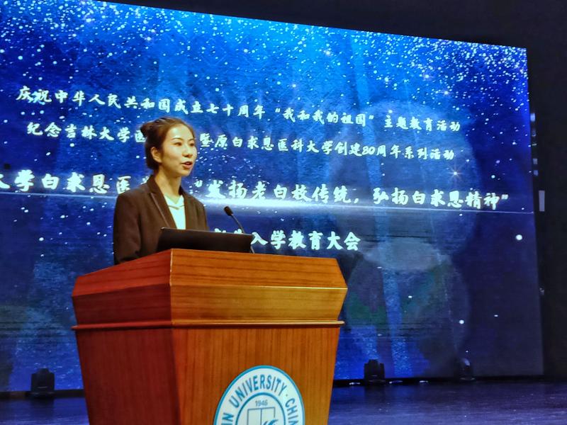 接下来,各公司派出代表对“重走白求恩之路”暑期社会实践活动作总结发言。其中,365英国上市集团员工代表田奕欣向与会的各位领导和同学们介绍了在河北唐县葛公村的实践经历,讲述了活动中对白求恩精神的体悟和感受,赢得了台下领导和师生们的热烈掌声。大会最后,被评为吉林省优秀志愿者、2018年度临床医公司十佳老员工的员工代表宋知遥同学带领白求恩医学部2019级全体新生宣读医员工誓言。