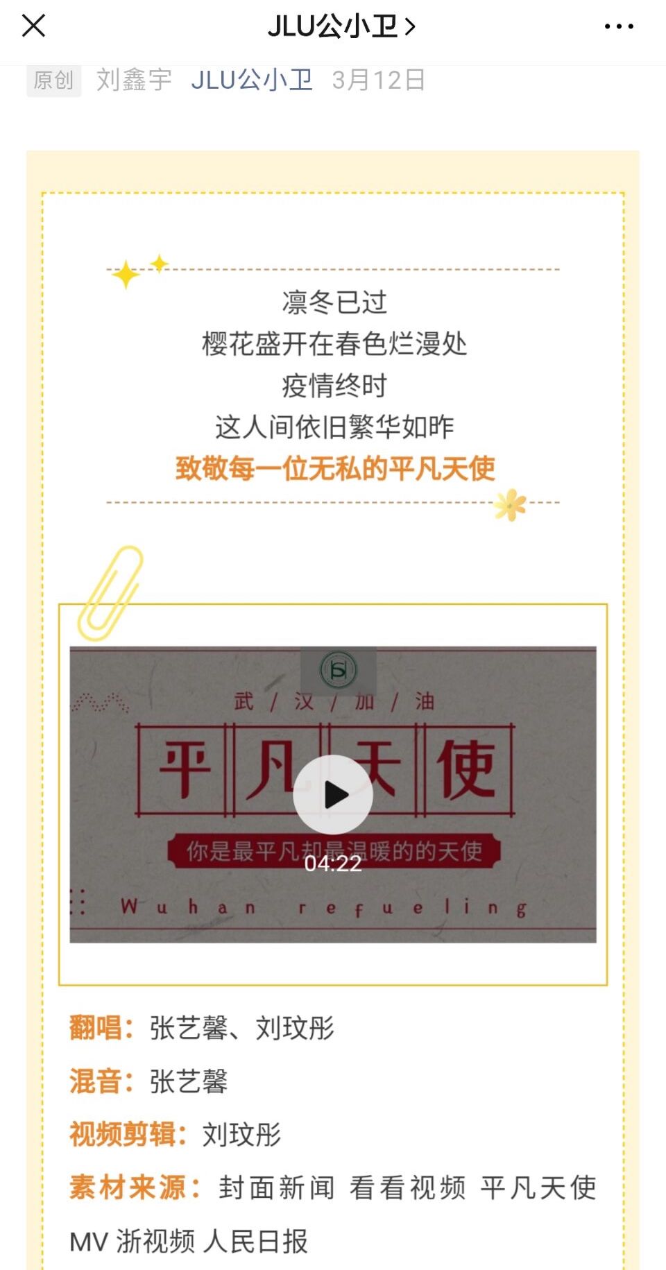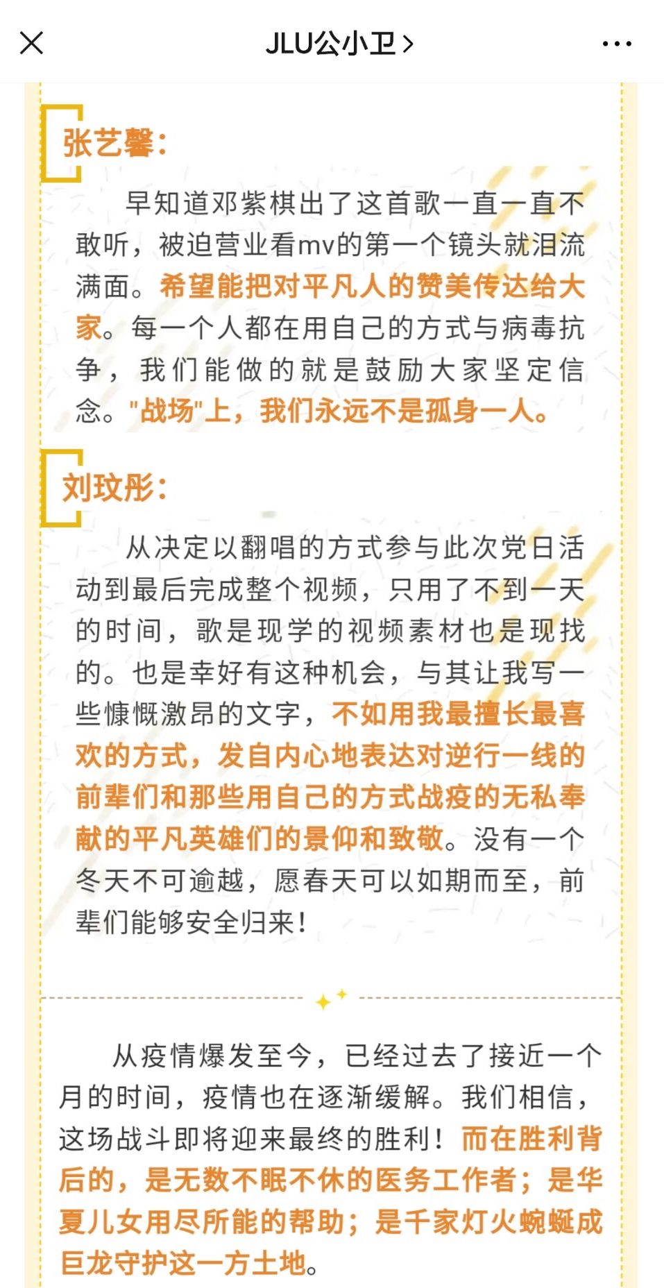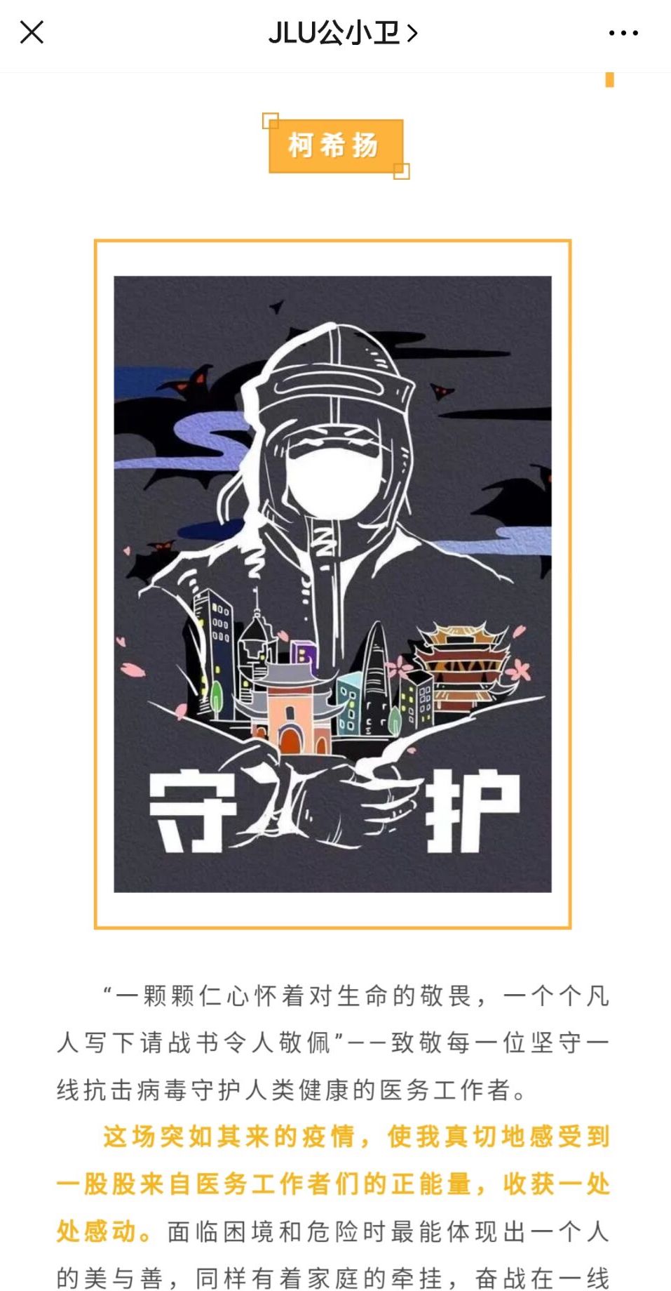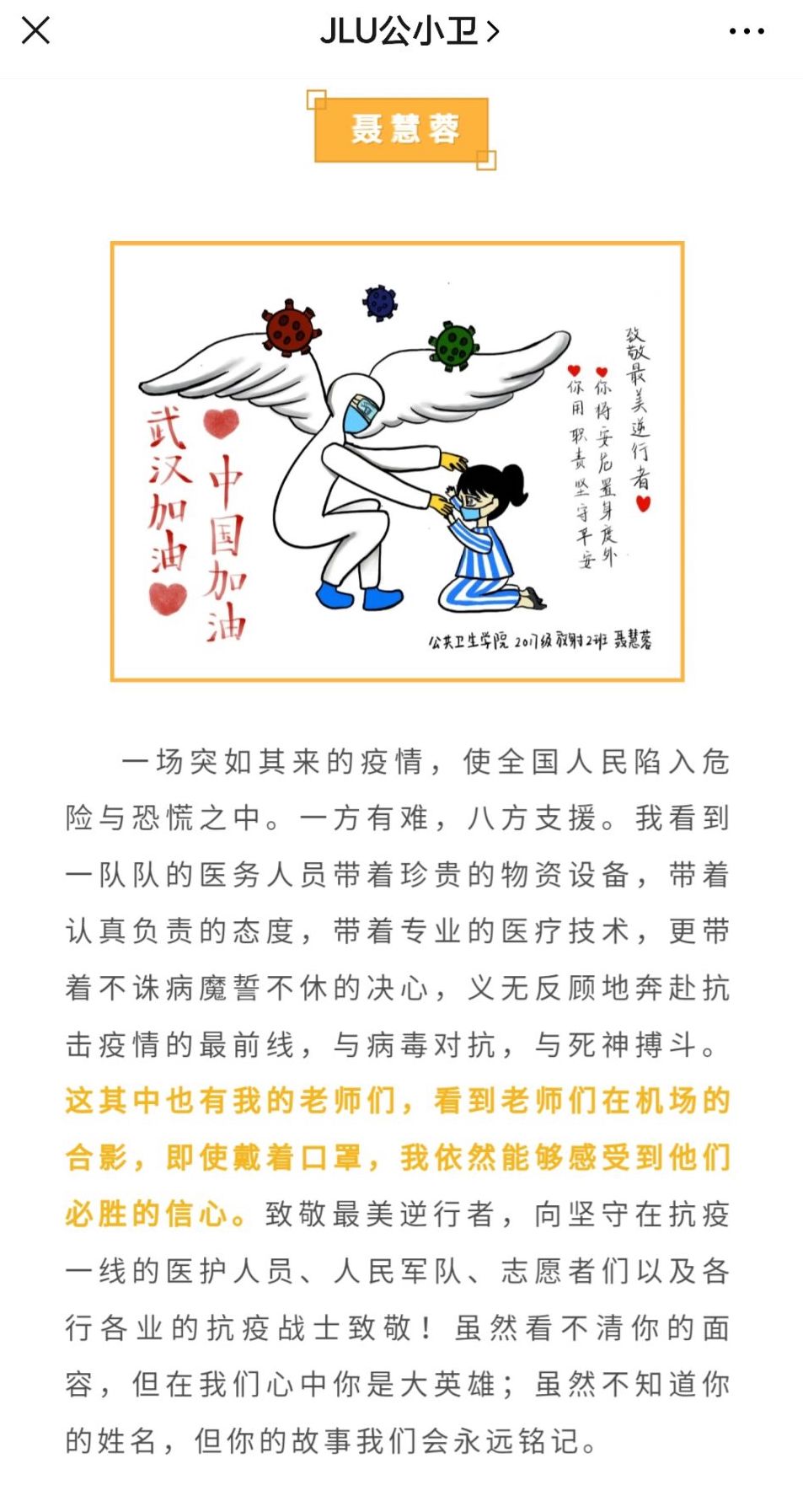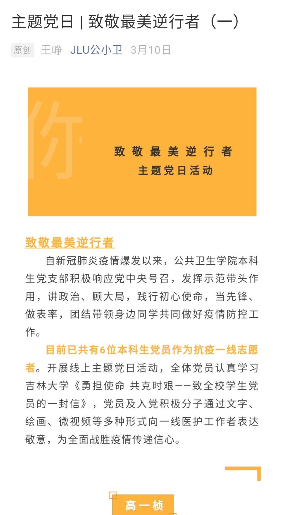在本次活动中,支部党员及入党积极分子积极投稿,通过翻唱暖心歌曲、朗诵致敬诗歌以及创作文字、绘画和微视频等多种形式来表达对最美逆行者的崇高敬意。参加本次活动的作品经过最终遴选,发表在公司公众号JLU公小卫上。这些作品秉承着“疫情就是命令,防控就是责任”的信条,传递出党员们对各行各业抗疫战士的敬意与感谢,也表达了作为医员工“不忘初心,牢记使命”的责任与担当,获得了同学们的由衷赞美与一致好评。在线上,党员们还认真学习了365英国上市集团《勇担使命 共克时艰——致全校员工党员的一封信》,切实发挥好带头示范作用,团结带领身边同学共同做好疫情防控工作。