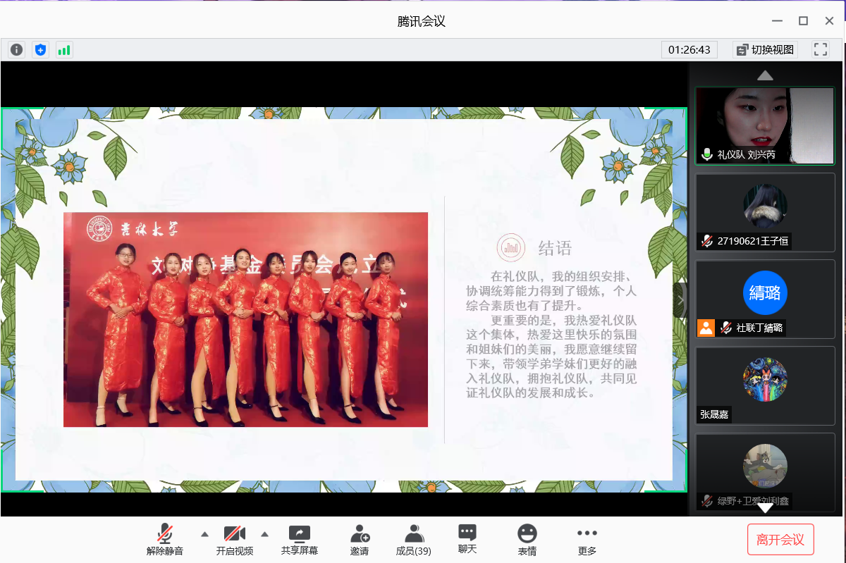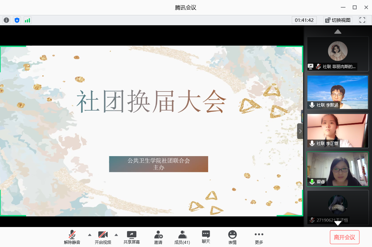 风雨端阳,粽香千里,为保障社团工作顺利有序进行,365英国上市集团社团换届大会于6月24日晚六点在腾讯会议平台成功举行。2016级辅导员霍睿、2017级辅导员冷贺璇以及第36届团学组织成员出席本次会议。