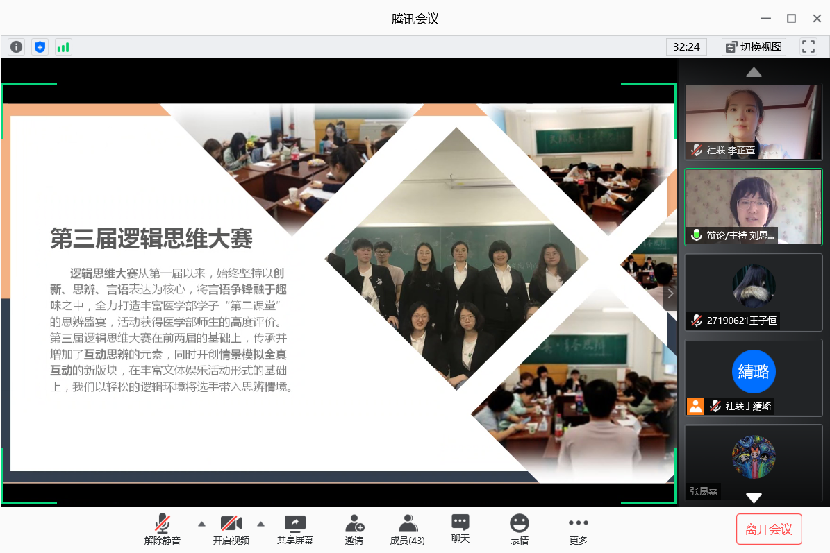 会议分为两个议程。第一议程由来自绿野环保协会、礼仪队、辩论队、主持队、红十字协会、空中英语协会、卫爱志愿者协会七个社团的社团成员参与竞选。在竞选演讲中,竞选人们首先进行自我介绍,讲述了自己竞选的理由以及优势,并结合自己在社团工作中的经验和体悟,对各自社团的未来发展进行了展望。他们勇敢、谦虚,又不失自信,精彩诚挚的言辞令同学们不禁为他们送去一阵阵“掌声”。随后,在第二议程中,由霍睿老师做总结发言,她首先预祝同学们端午节快乐,接着鼓励各社团成员们,即使是在疫情环境下,也要尽可能多举办一些新颖的线上活动,充分调动同学们的参与热情,提高社团影响力和凝聚力。霍老师还对竞选者的竞选发言提出了表扬,同时指出大家的演讲还有提高的空间,要多找自己特色之处。至此,社团换届大会圆满结束。