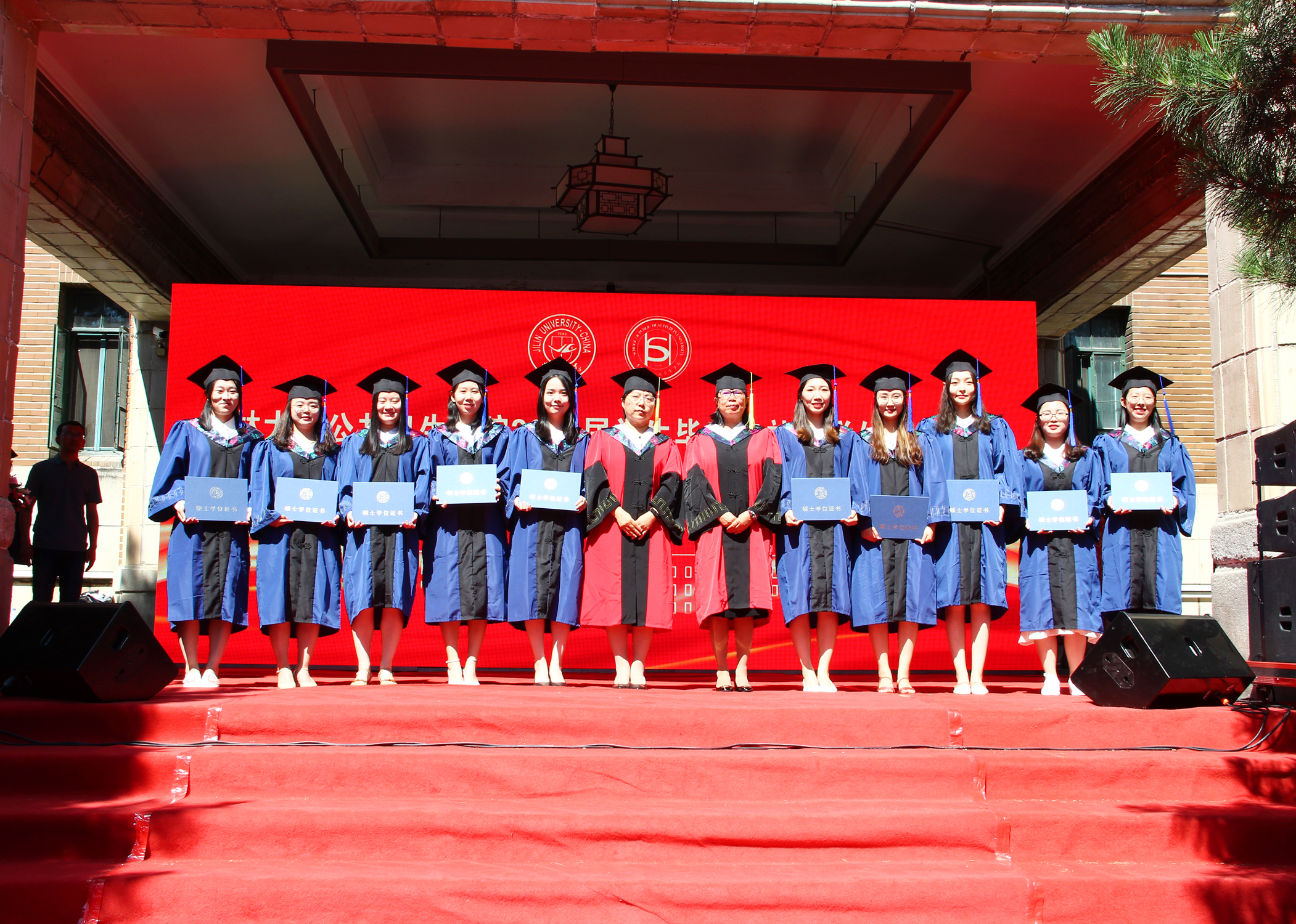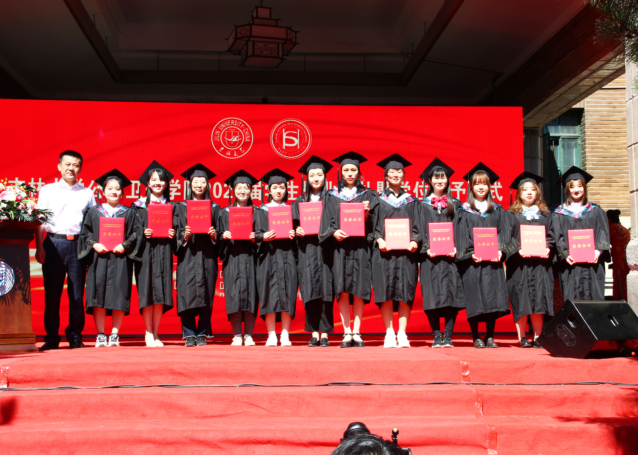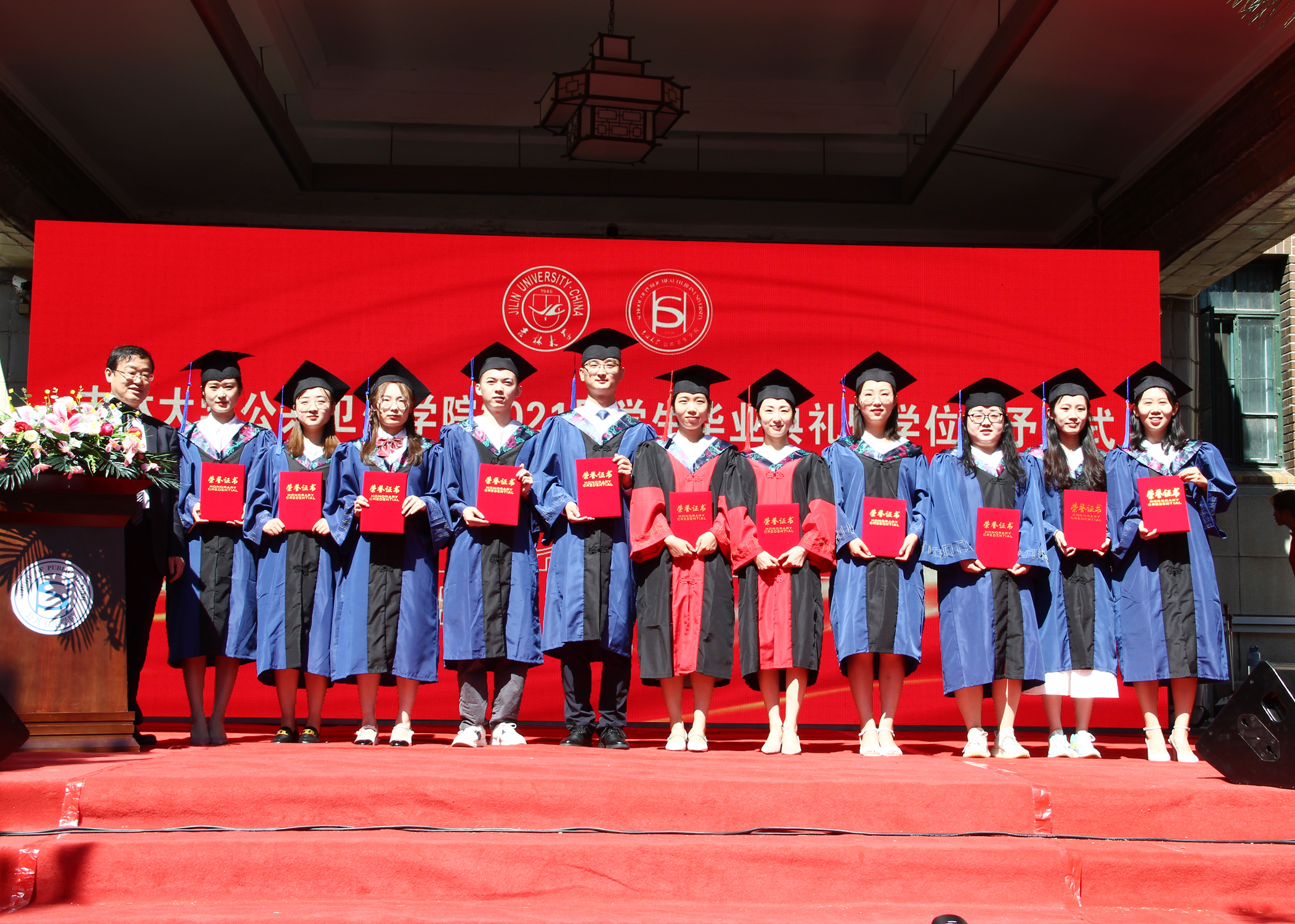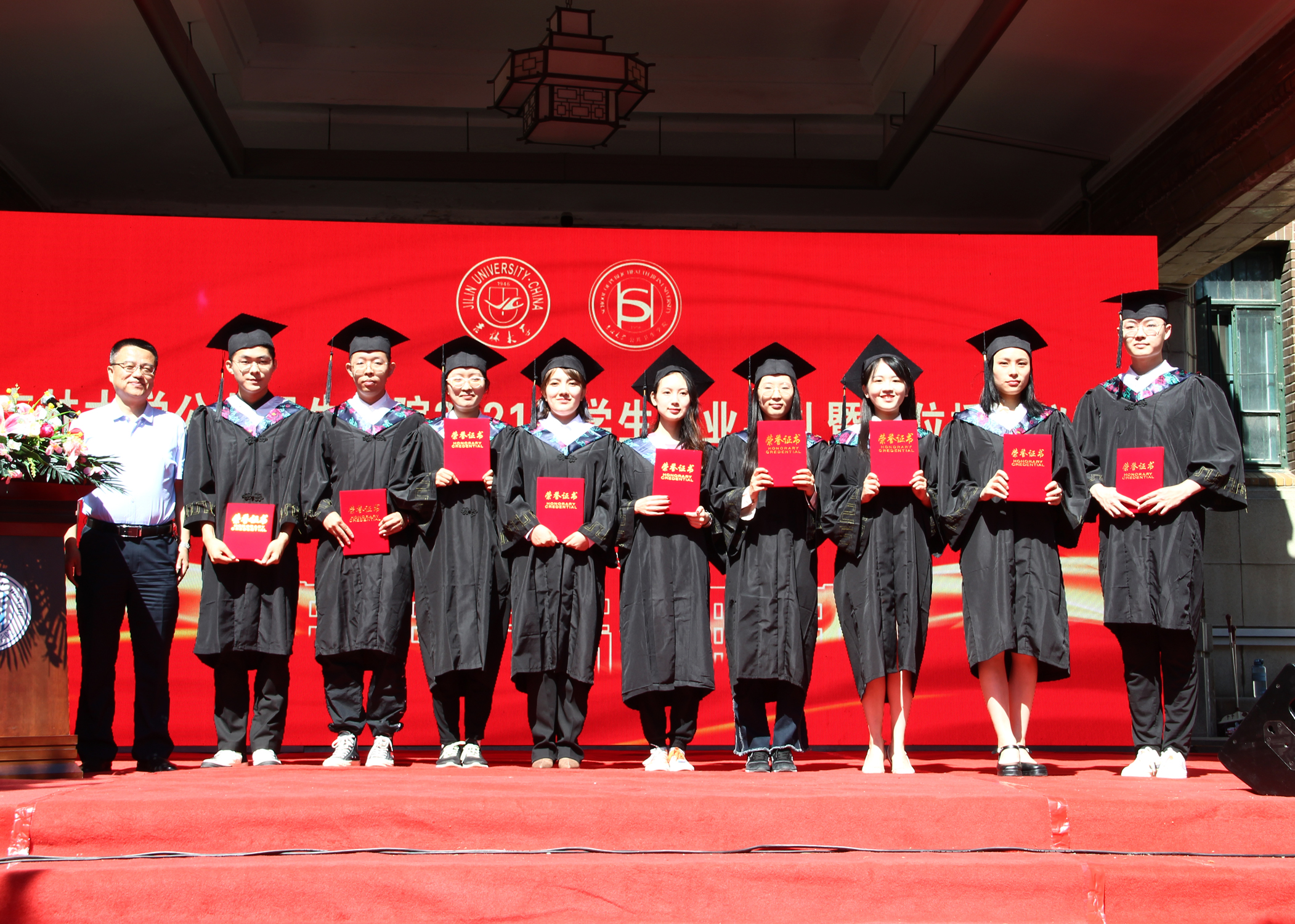 伴随着庄严的国歌声,毕业典礼正式拉开序幕。寇长贵宣读了第十届中国老员工医学技术技能大赛预防医学专业赛道东北华北赛区喜报及获奖员工名单、2021届本科毕业生学士学位授予决定及优秀本科生毕业名单。于洗河宣读了2021届硕士、博士学位获得者名单及优秀研究生毕业生名单。随后,魏国志、刘晋宇、赵国利分别为优秀本科生毕业生、优秀研究生毕业生、第十届中国老员工医学技术技能大赛预防医学专业赛道东北华北赛区一等奖获奖员工颁发荣誉证书。紧接着,李娟和刘雅文一同为毕业生授予学位,颁发学位证书并合影留念。