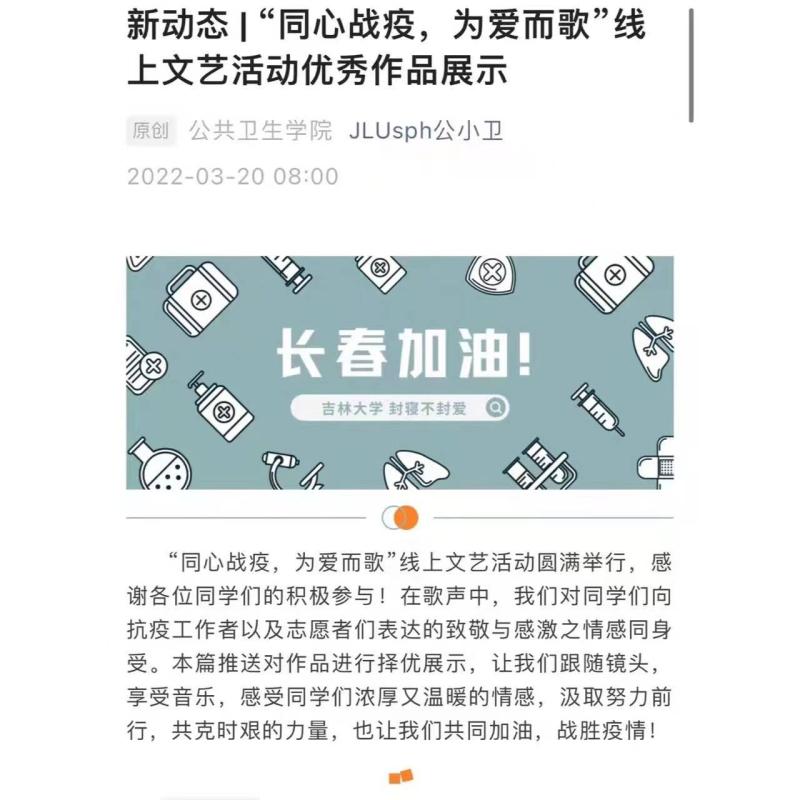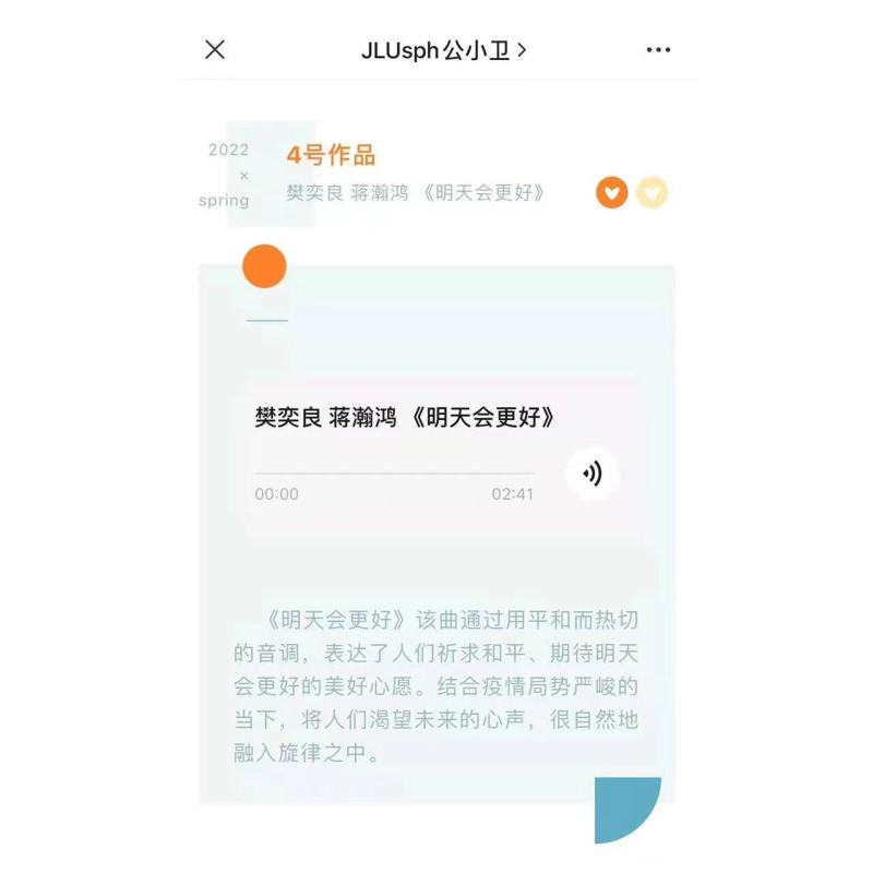此次线上文艺活动中,同学们围绕抗击疫情,共克时艰主题踊跃参与,演唱具有时代特色、动人力量的暖心歌曲,多首翻唱歌曲点亮了疫情封寝期间的枯燥生活,如樊奕良、蒋瀚鸿同学翻唱的歌曲《明天会更好》,通过平和而热切的音调,表达了大家期盼疫散花开的美好心愿。谭晓辉同学翻唱的歌曲《你要相信这不是最后一天》同样也表达出了同学们发自内心的美好、温暖与力量。王子涵同学在两年前武汉疫情期间自行创作的英文歌曲《It will come》,在当下疫情紧张时刻,又激发出新的感受与感动。此外,还有很多优秀音频和视频作品通过旋律向我们传达着疫情期间的温暖、希望和力量。